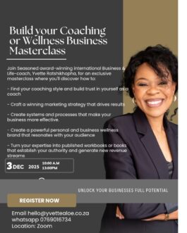 • Join Award-Winning Life Coach Yvette Ratshikhopha and other certified coaches and wellness educators on a Transformative Journey of Self-Discovery Coming Home to Yourself Wellness and Healing Retreat 7-9 November  2025| Meander Estate, Bronkhorstspruit, South Africa Embark on a life-changing weekend retreat with Yvette Ratshikhopha, renowned life coach, NLP practitioner, and author of "Coming Home to Yourself". This intimate gathering is…